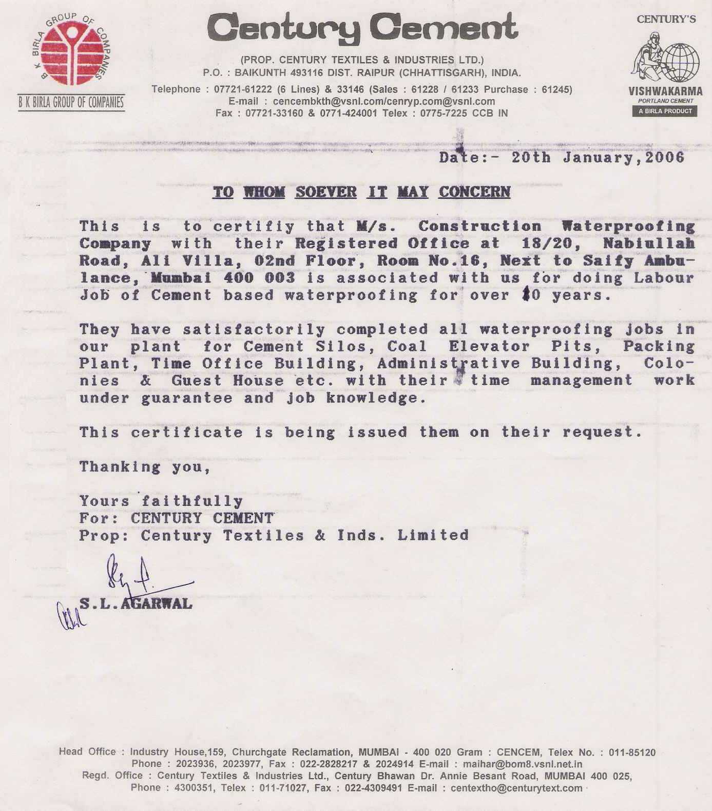 Century Cement - Aditya Birla Group of Companies - 20-01-2006