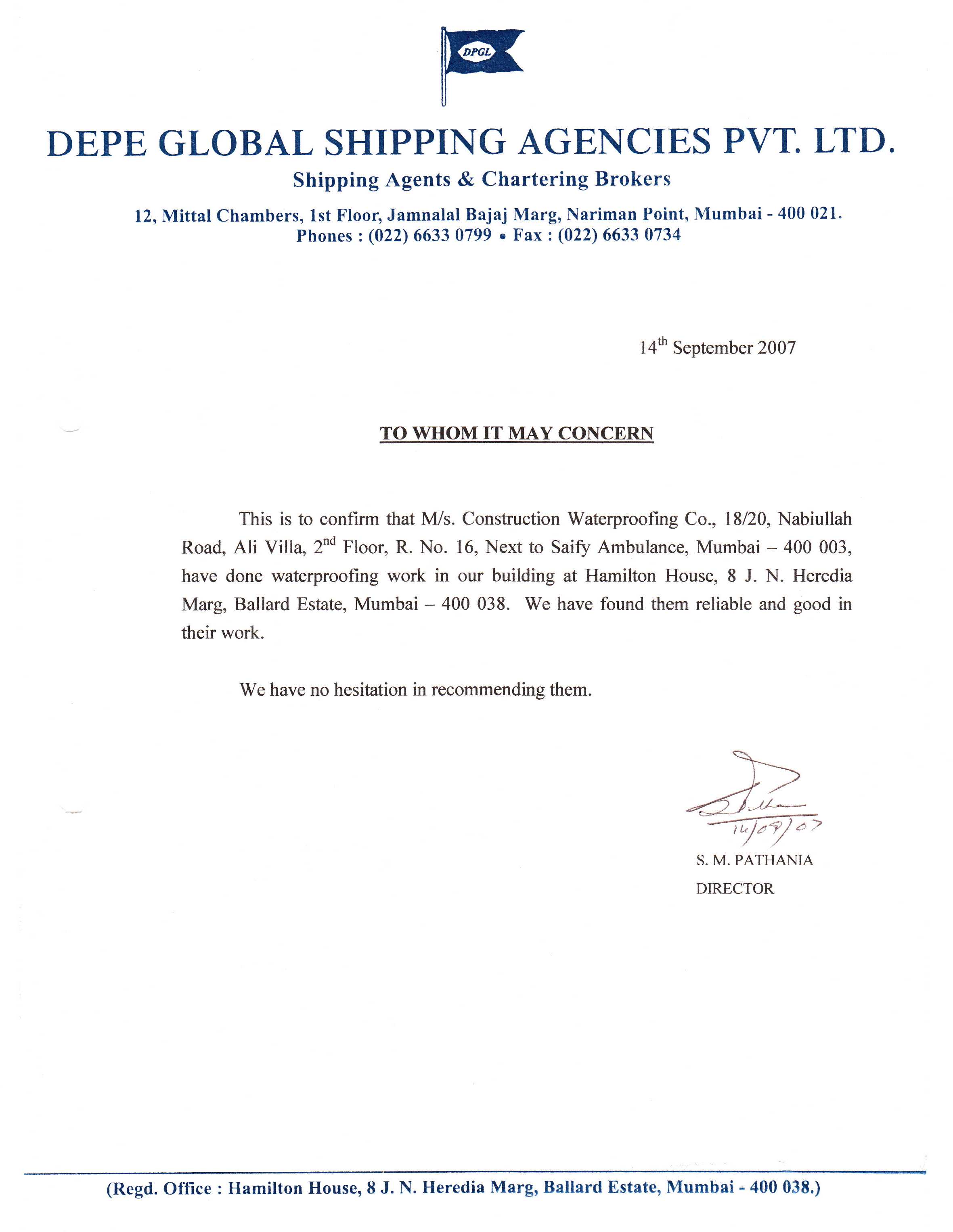 DEPE Global Shipping Agencies Pvt Ltd - 14-09-2007