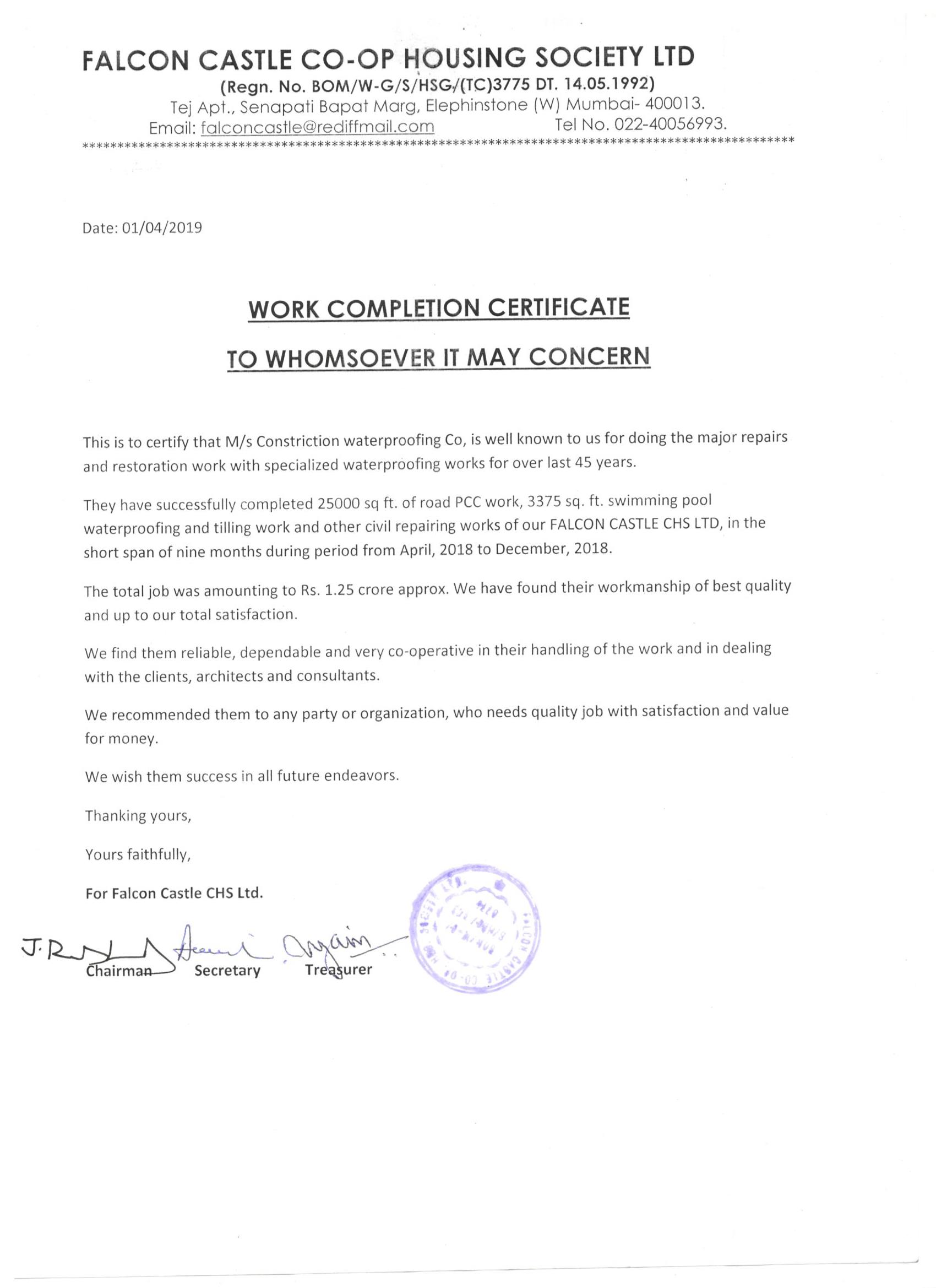 Falcon Castle CHSL - Lower Parel - PCC Work - 1.25 crores - 01-04-2019