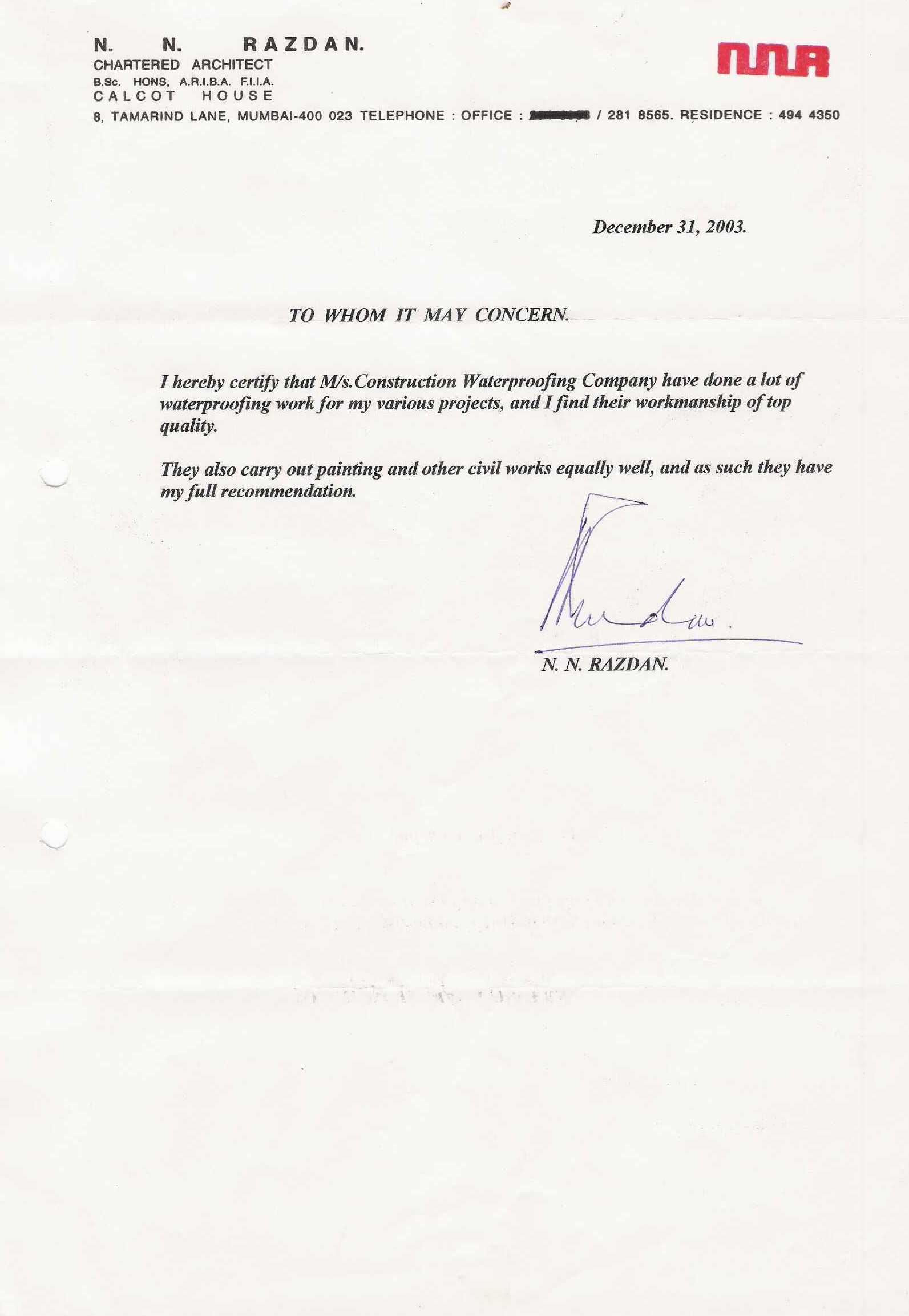 N N Razdan - Bombay House - 8, Tamarind Lane, Fort - 31-12-2003