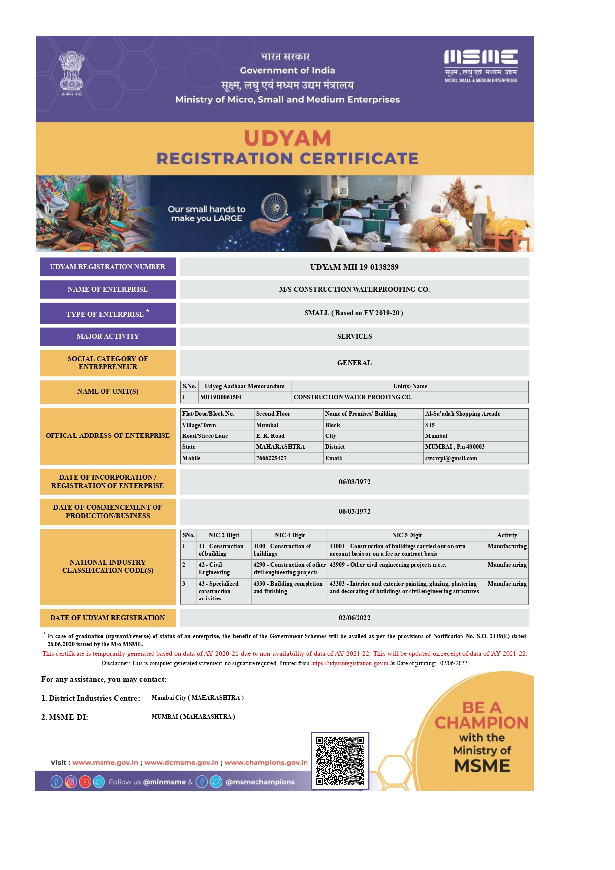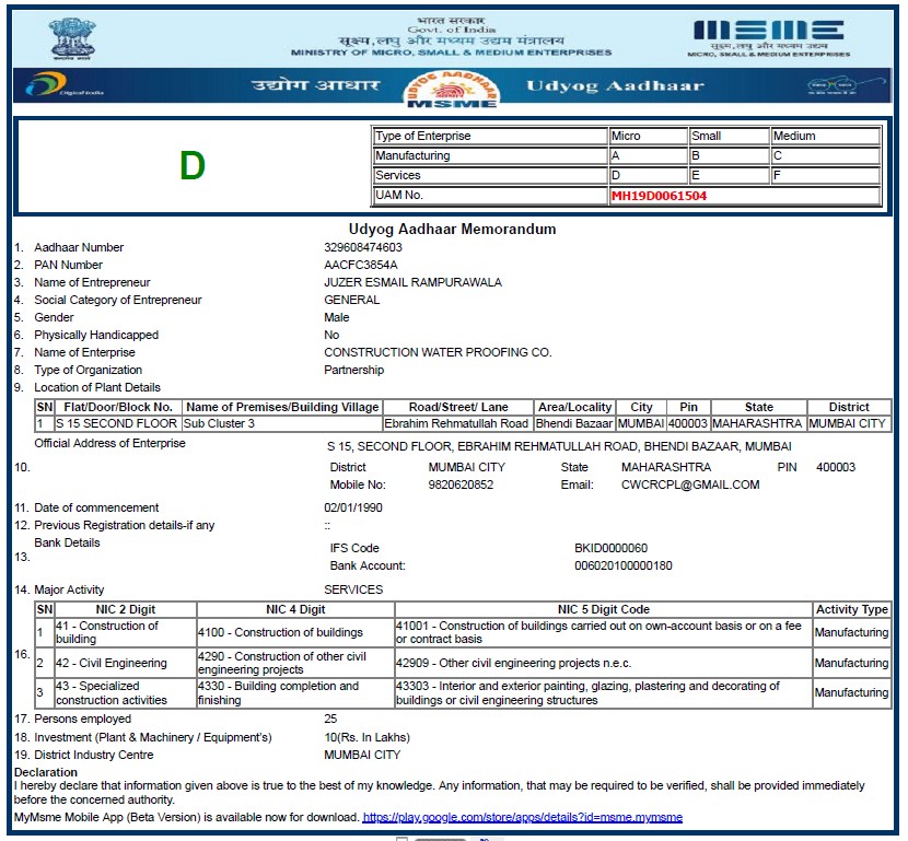 MSME Certificate - MH19D0061504