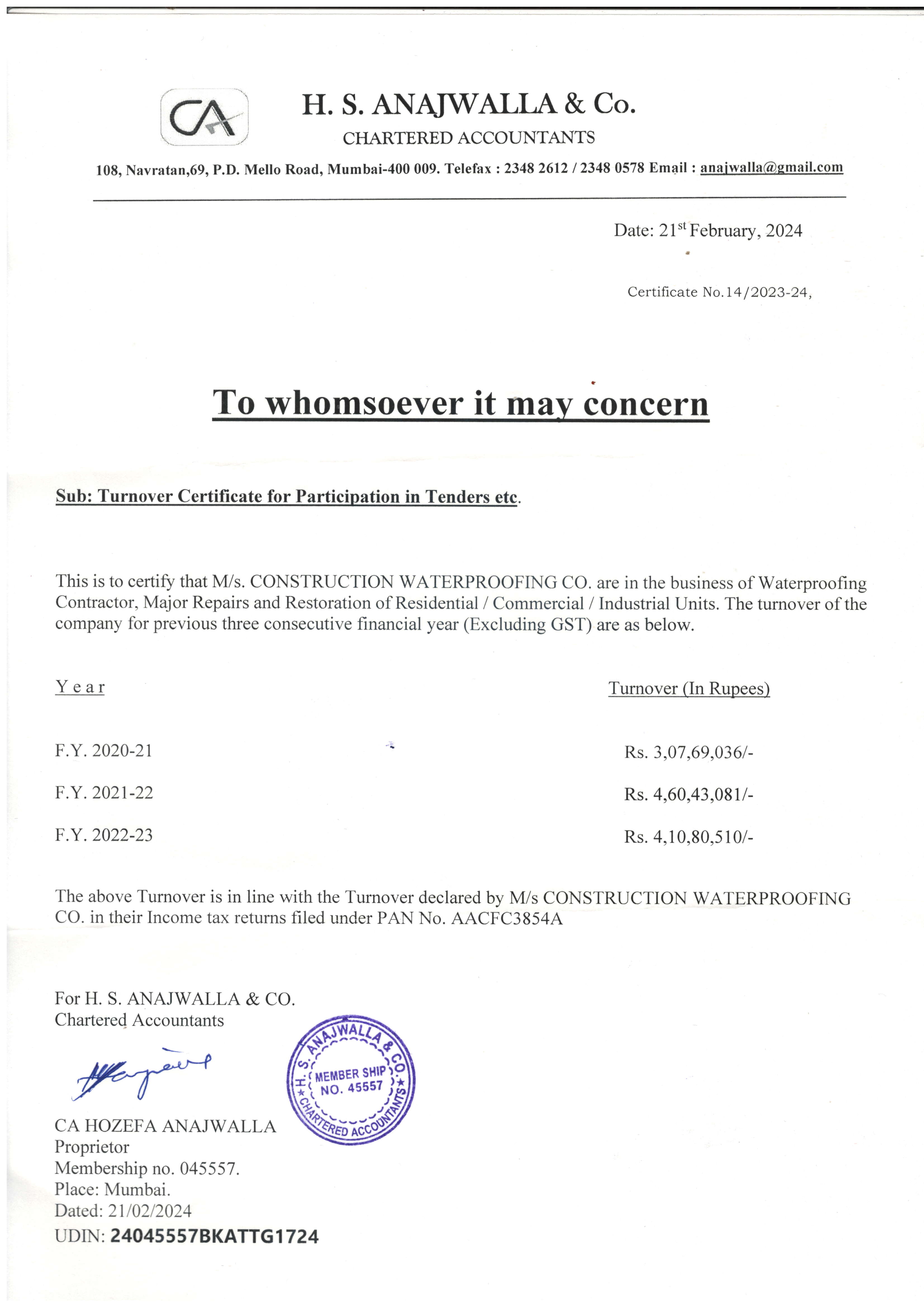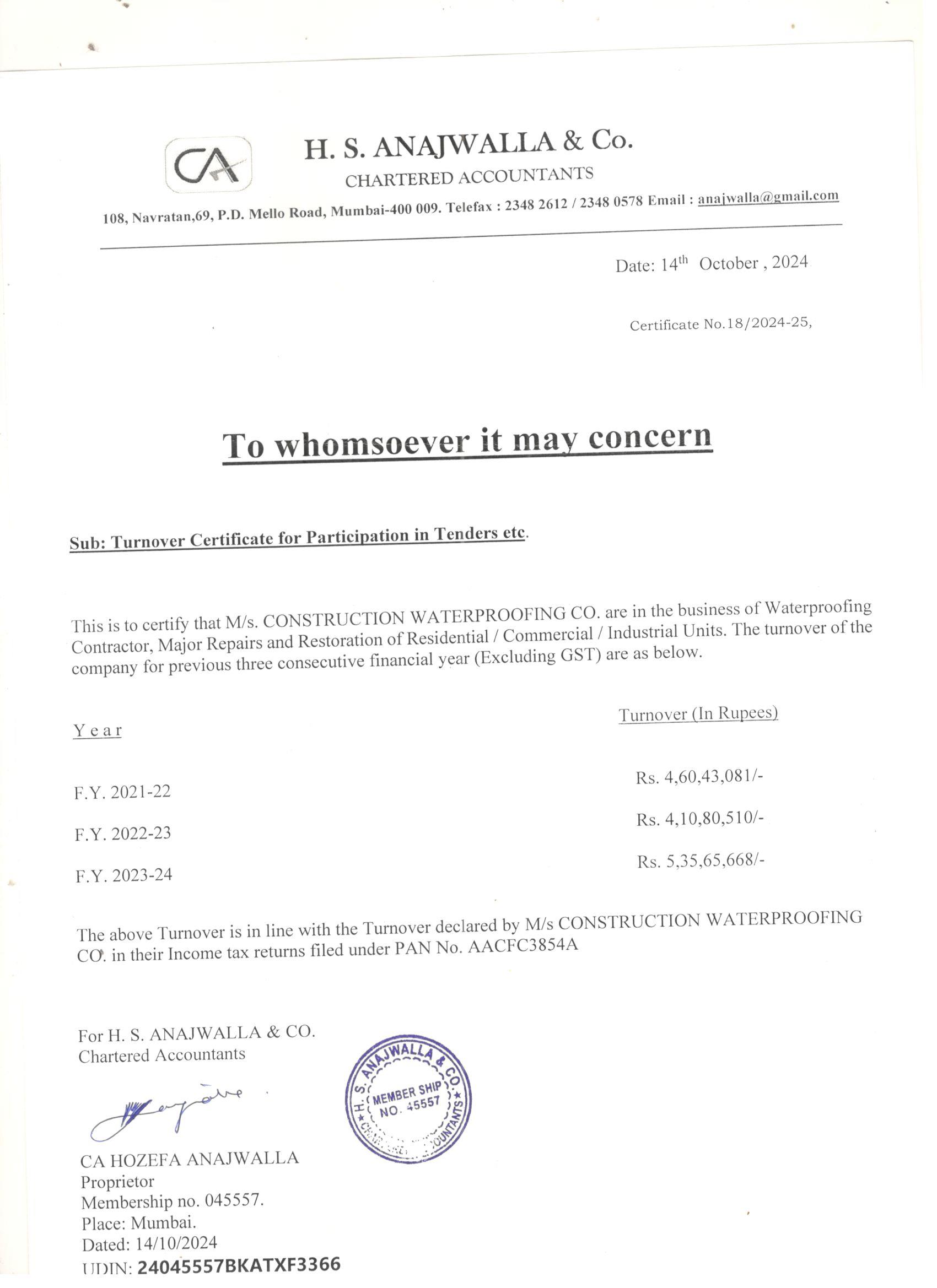 Turnover Certificate - 3 years