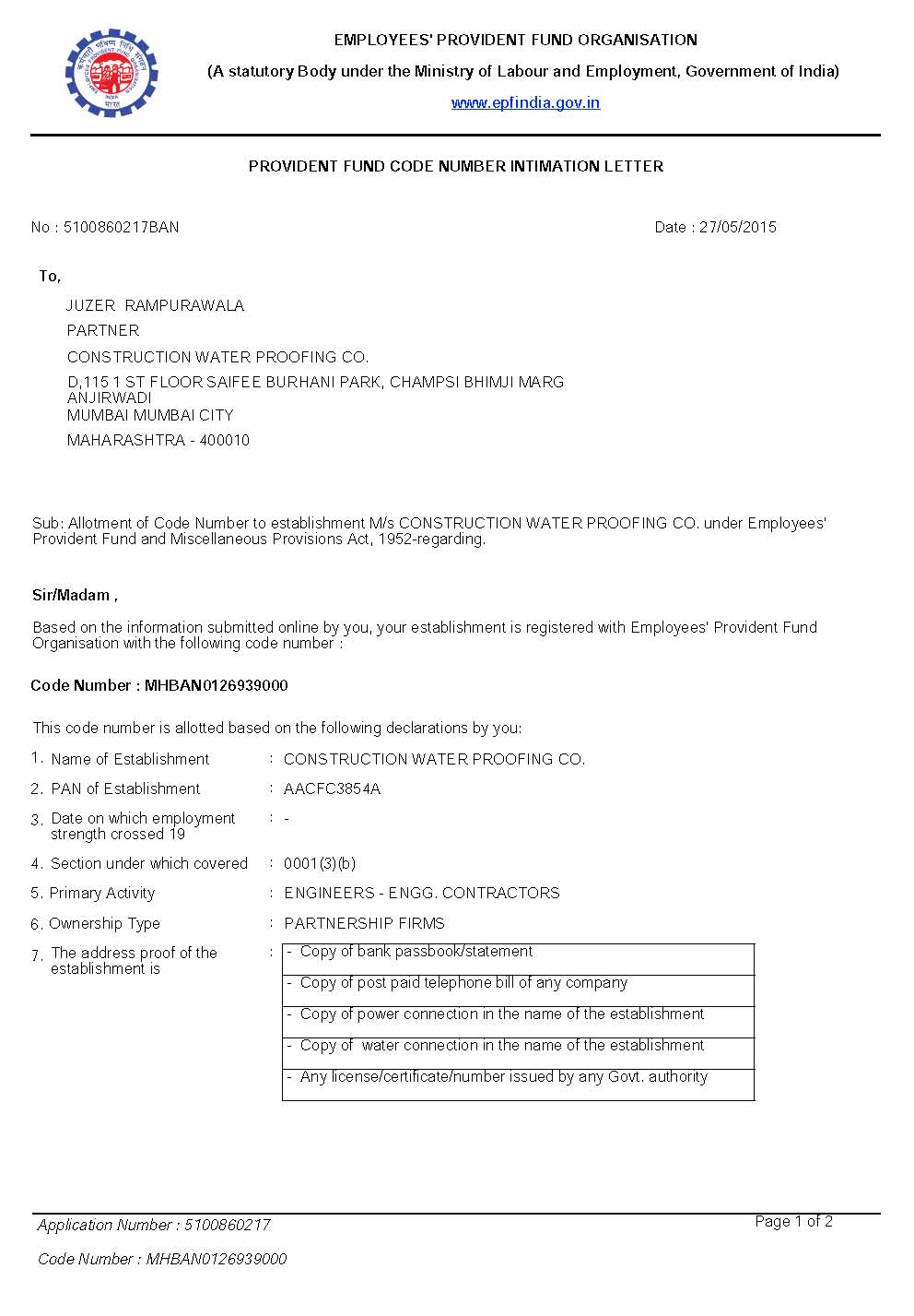 Provident Fund Allotment Letter - Page 1