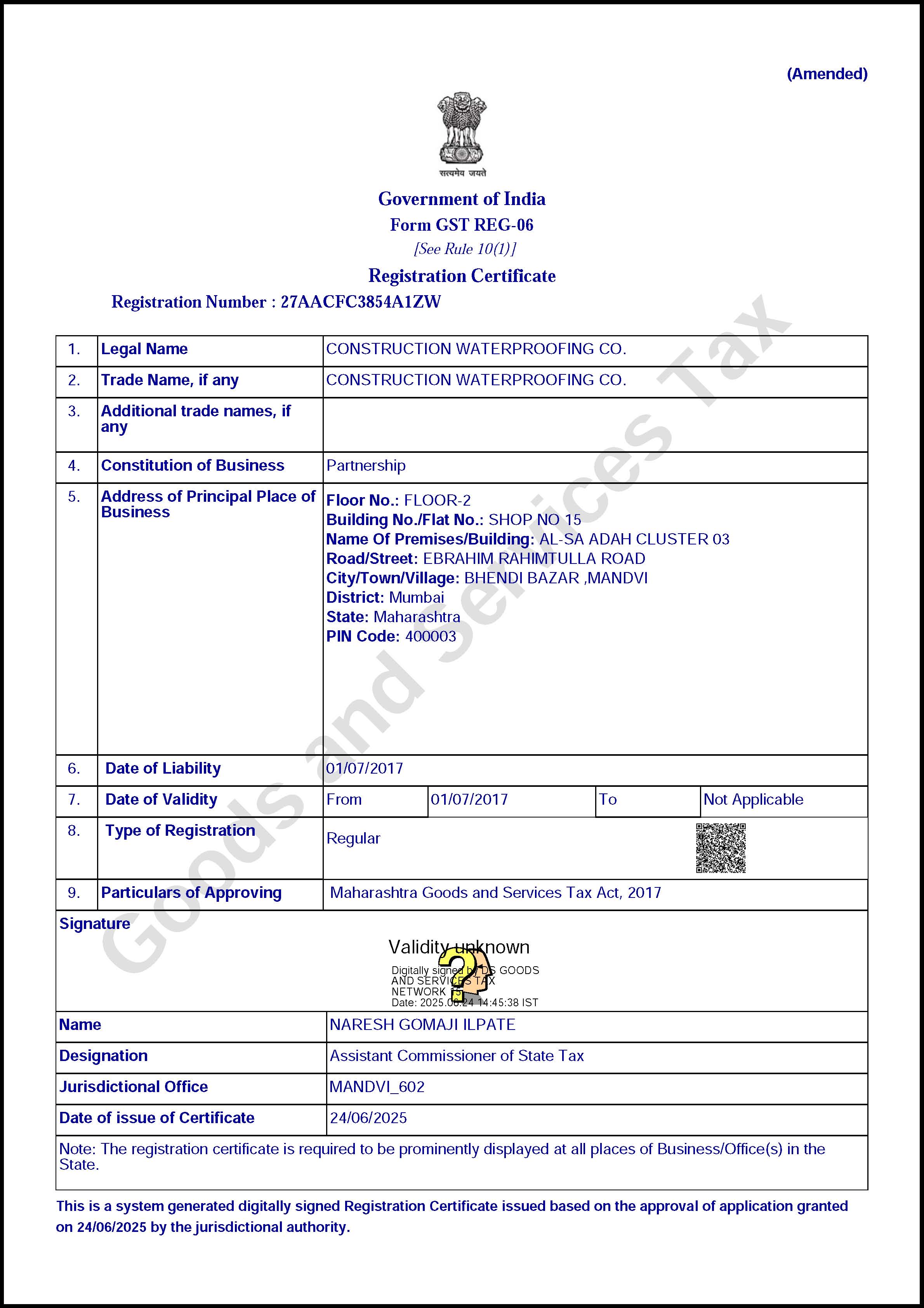 GST Certificate - 27AACFC3854A1ZW - Page 1